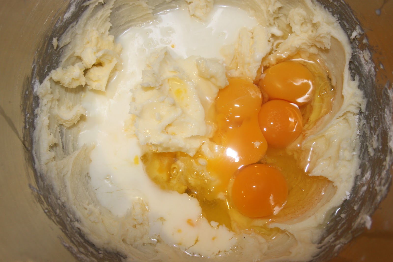 Mélanger les oeufs battus avec le lait et ajouter petit à petit ce liquide, tout en mélangeant à la crème beurrée. Sur la photo: j’ai tout ajouté d’un coup et ce n’est pas la chose à faire!! Faire comme indiqué ci-dessus…! Sinon, il faudra de l’huile de coude pour enlever les grumeaux!