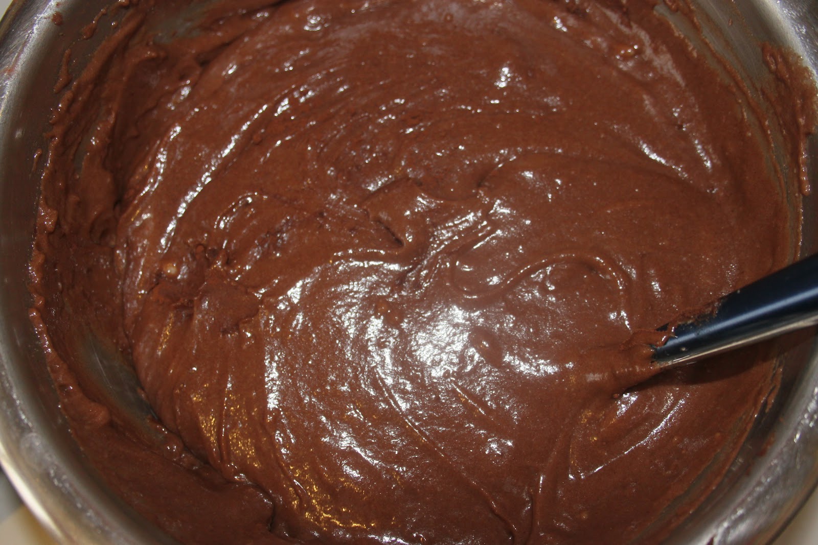 - Beurrer ou chemiser de papier sulfurisé un moule (à cakes, à manqué, à flan…). J’ai utilisé ici un moule anti-adhérent un soupçon de bombe à graisse à démoulage. Verser les deux pâtes (chocolatée et nature) en alternance dans le moule. On peut aussi ajouter 3-4 cuillerées à soupe d’une pâte puis de l’autre à un endroit unique du moule. On peut faire en fait ce que l’on veut!
