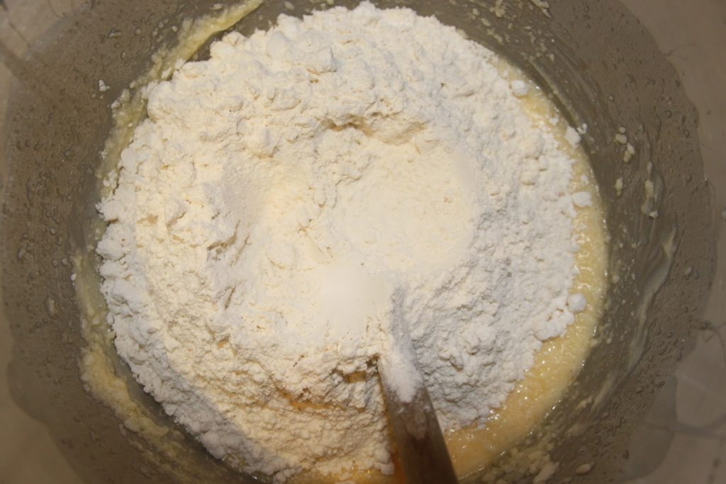 - Mélanger la farine et la levure puis ajouter d’un coup au mélanger précédent.