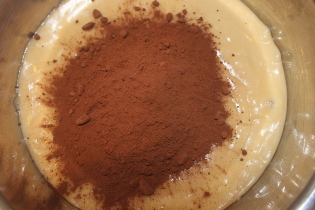 - Séparer la pâte en deux: dans une moitié, ajouter le cacao tamisé.