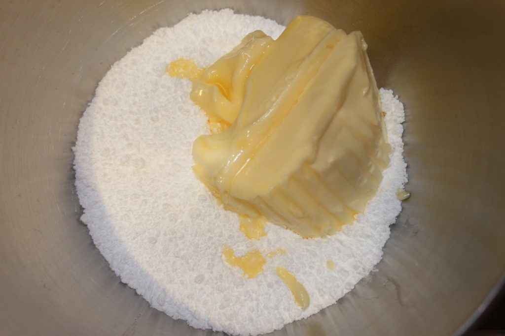 - Mélanger le beurre mou avec le sucre glace jusqu’à obtenir une crème.