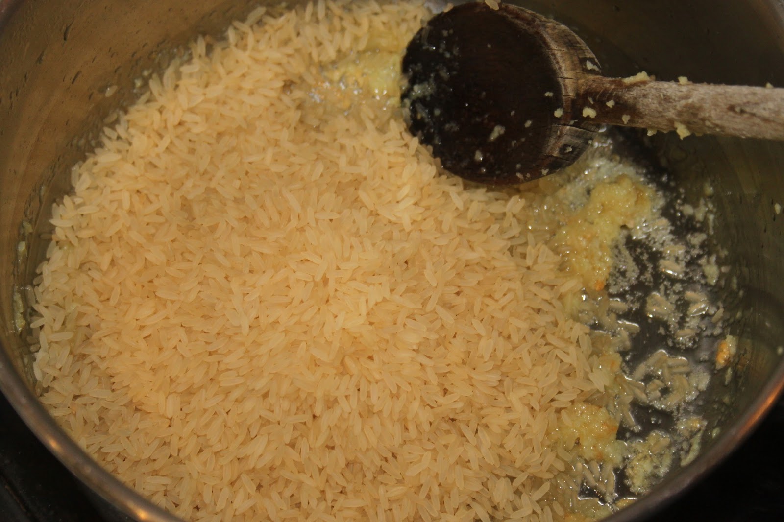 Quand l’ail et le gingembre commencent à sentir vraiment bons, ajouter le riz.