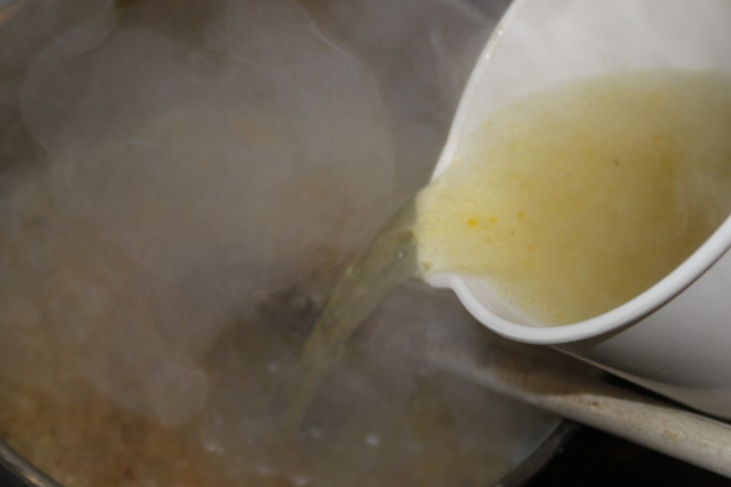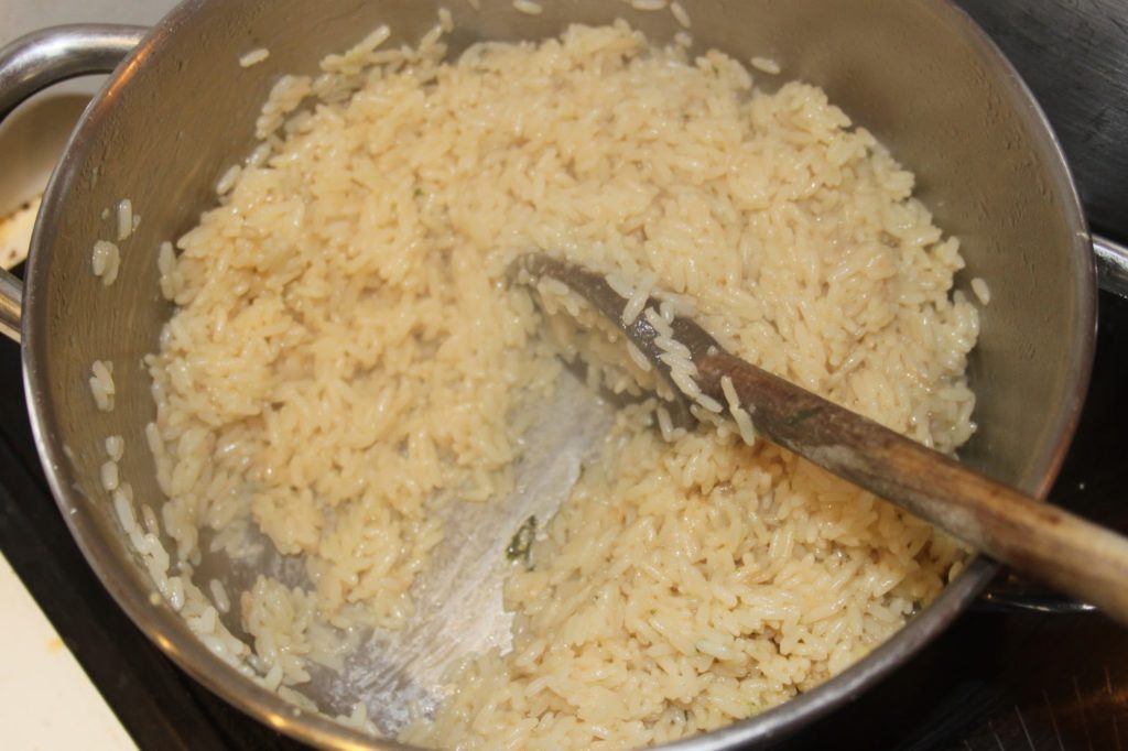 - Laisser le riz cuire dans le gras pendant une ou deux minutes puis ajouter tout le bouillon (de la cuisson du poulet) d’un coup.