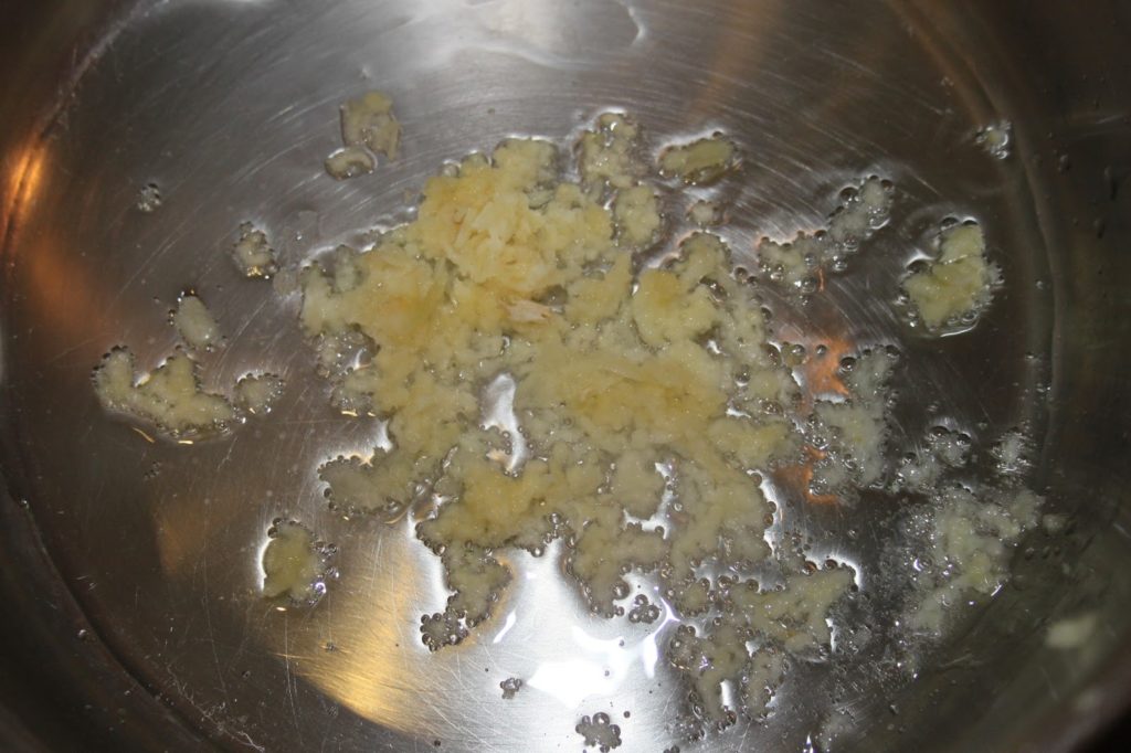- Pour le riz, ce sera une cuisson pilaf (qui est une technique originaire d’Asie du sud est). Mettre l’huile dans une casserole et ajouter les gousses d’ail écrasées.