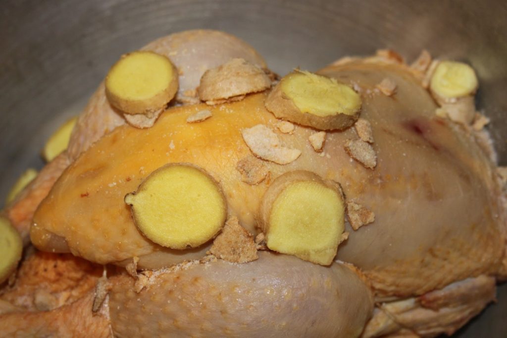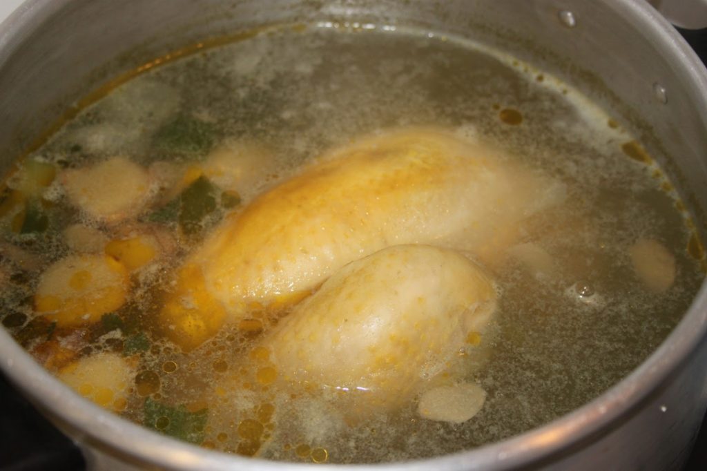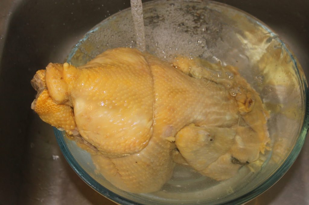 - Enlever le poulet de la marmite (en gardant bien le jus) et passer le poulet dans un grand bol d’eau froide et en le rinçant bien pour le refroidir sous un filet d’eau froide. De cette façon, on va stopper net la cuisson et le poulet gardera tout son moelleux et la peau ne craquera pas.Poursuivre la cuisson du bouillon pendant une bonne heure à ébullition cette fois.