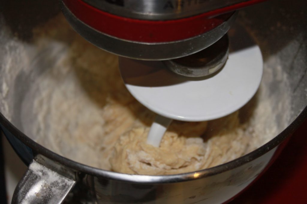 Au bout de quinze minutes, la pâte s’est lissée et commence à devenir élastique (sous l’effet de la levure).