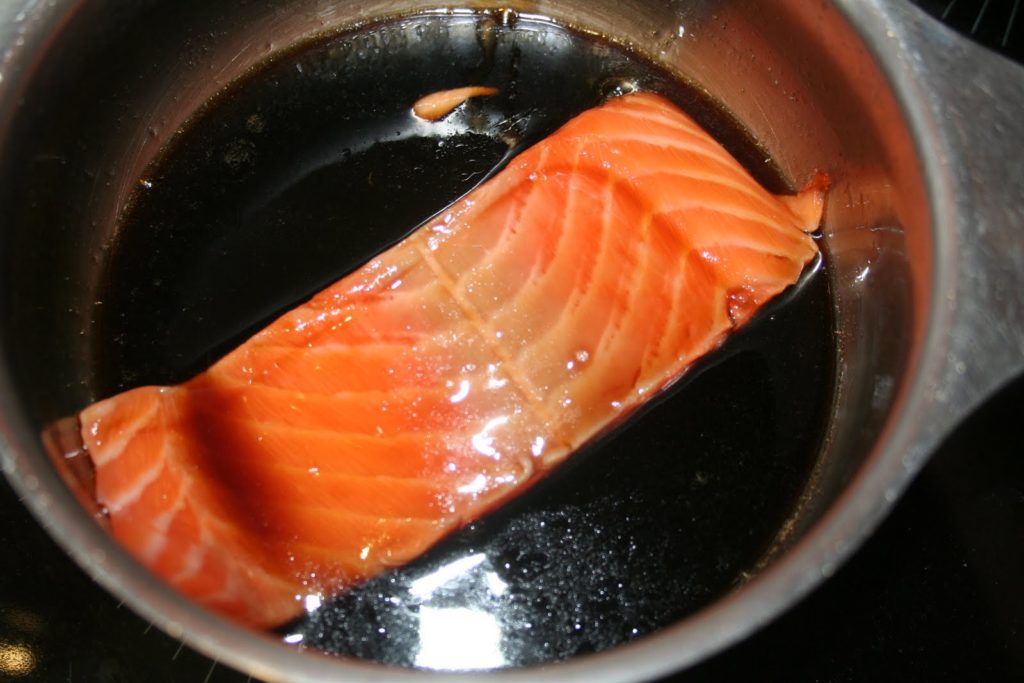 Mettre le saumon cru directemement dans la sauce chaude. Cela va précuire le saumon. Laisser mariner au moins deux heures.
