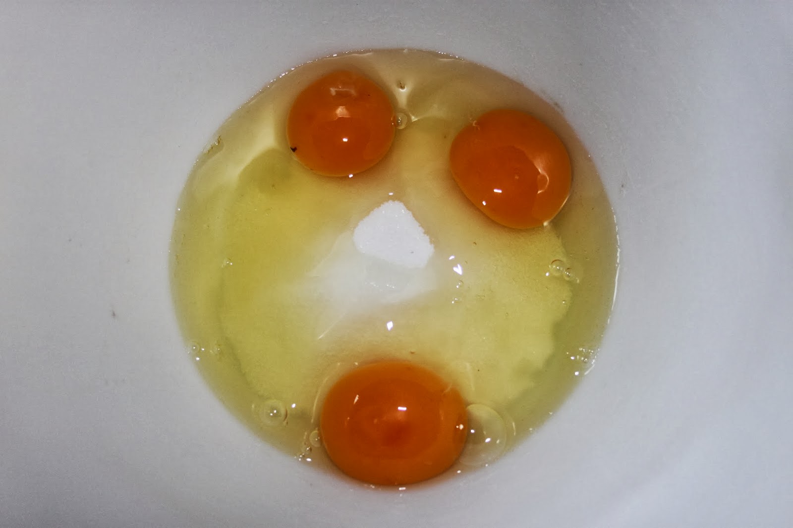 Préchauffez votre four 200°C.Mettez les œufs et le sucre dans un bol ou dans la cuve d’un robot. Important: si vous souhaitez un millasson à 2 phases comme ici, avec une couche plus dense au fond et une couche plus crémeuse sur le dessus, alors vous devez bien fouetter les œufs et le sucre ensemble. Si au contraire vous préférez un millasson plus homogène, il suffit de les mélanger sans insister du tout.