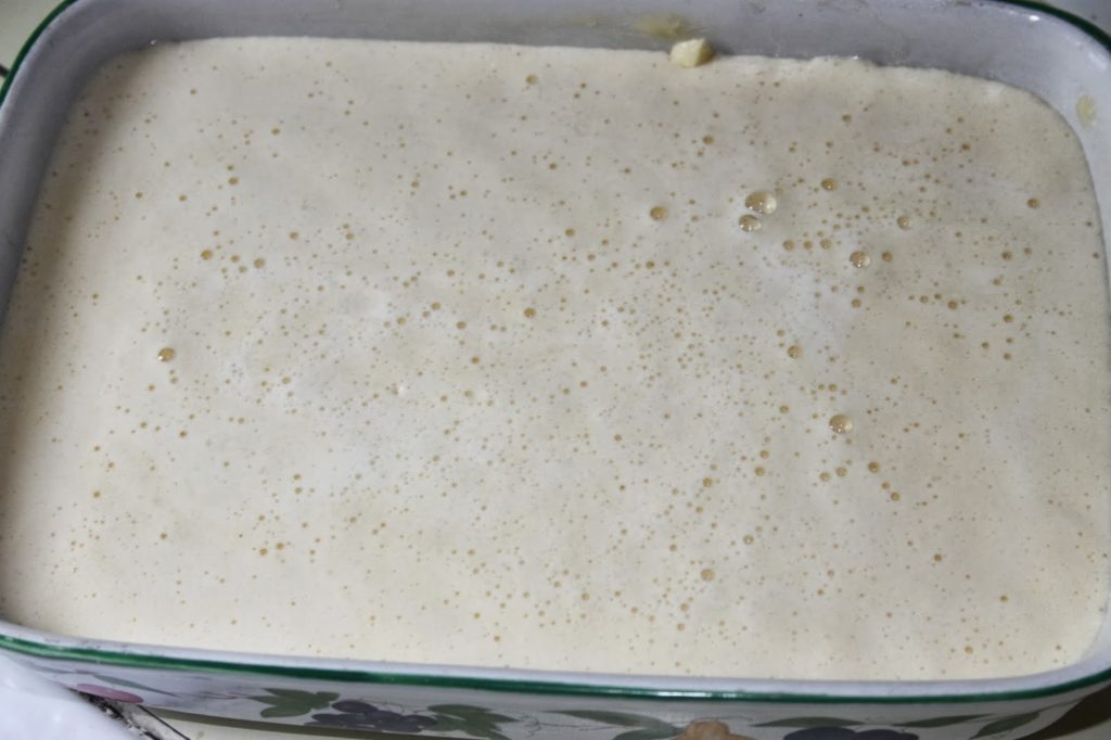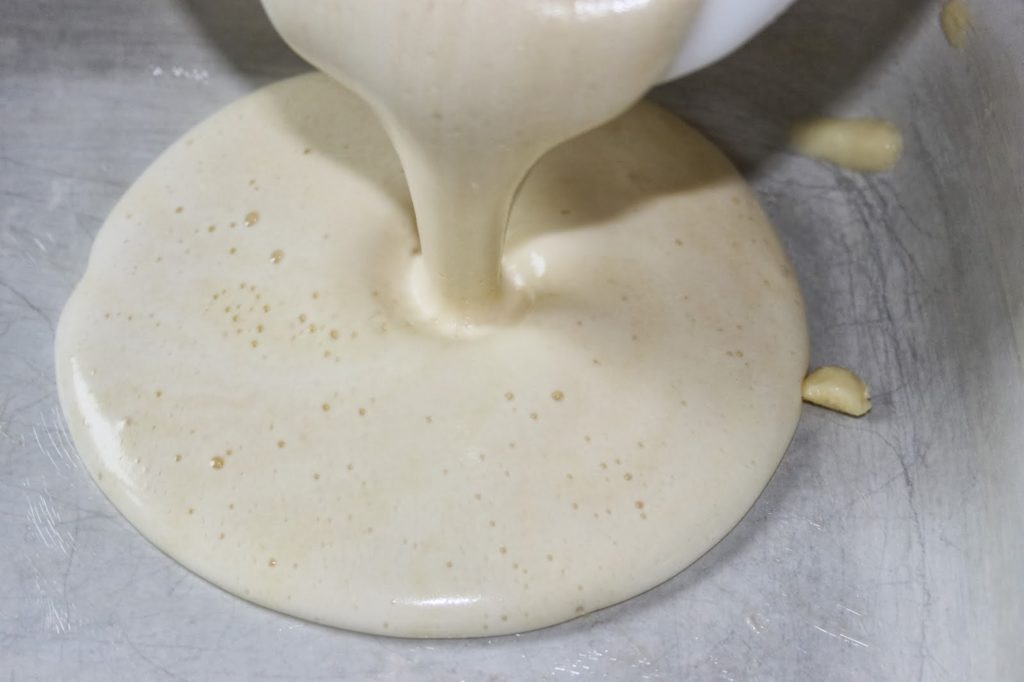 Puis versez la pâte. Ici elle est bien mousseuse car j’ai longuement battu. Encore une fois, si vous ne souhaitez pas de cette double couche, vous pouvez zapper l’étape des œufs battus avec le sucre…