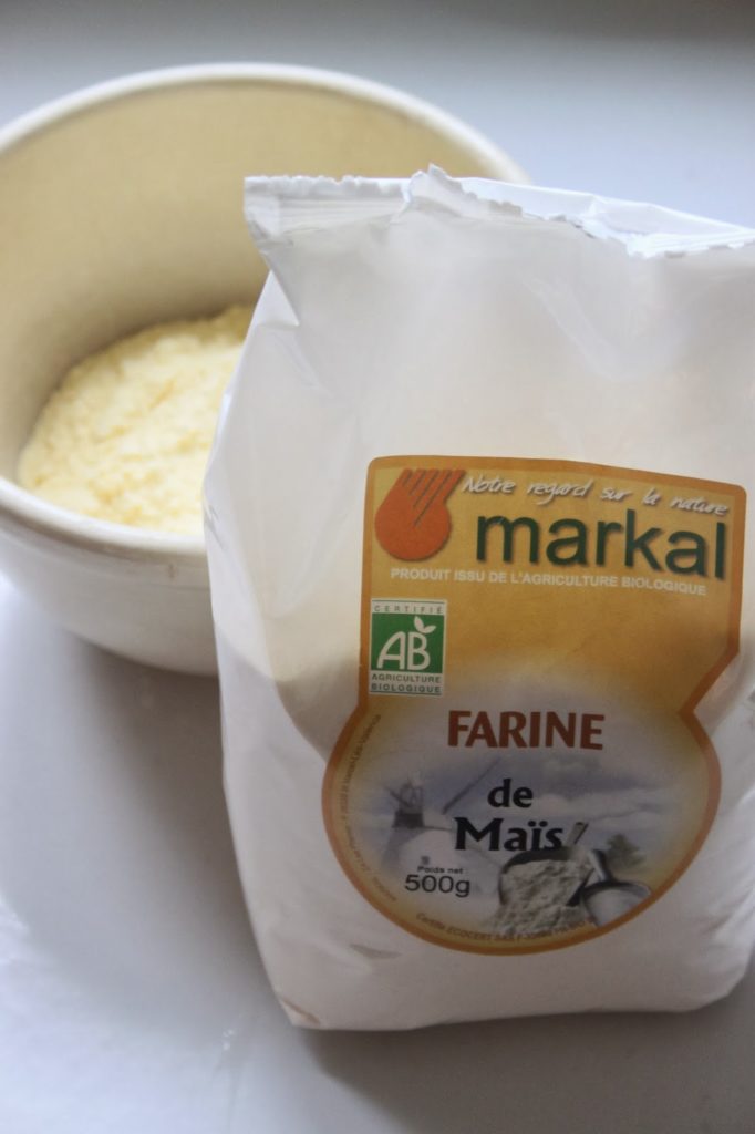 Voici la farine de maïs. Ce n’est pas la même chose que la préparation à polenta qui est plutôt une semoule de maïs. Vous trouverez cette farine dans toutes les boutiques bio ! Vous n’êtes bien sûr pas obligés de prendre de la farine bio, mais elle se trouve toujours dans ces boutiques.
