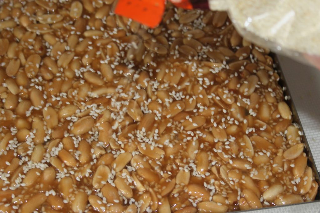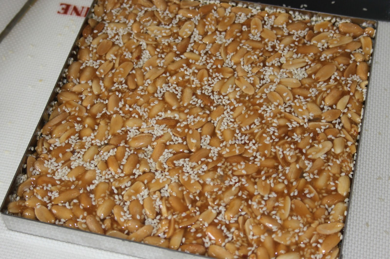 - Préparer un cadre de 18 sur 18cm posé sur un tapis de cuisson (ou un bon papier sulfurisé ou papier siliconé) en le huilant sur le bord intérieur (ou un coup de bombe de démoulage). Verser ensuite un petit lit de sésame.