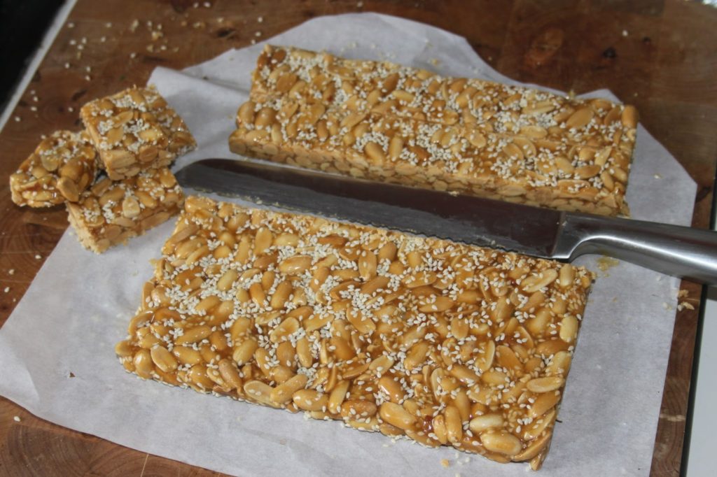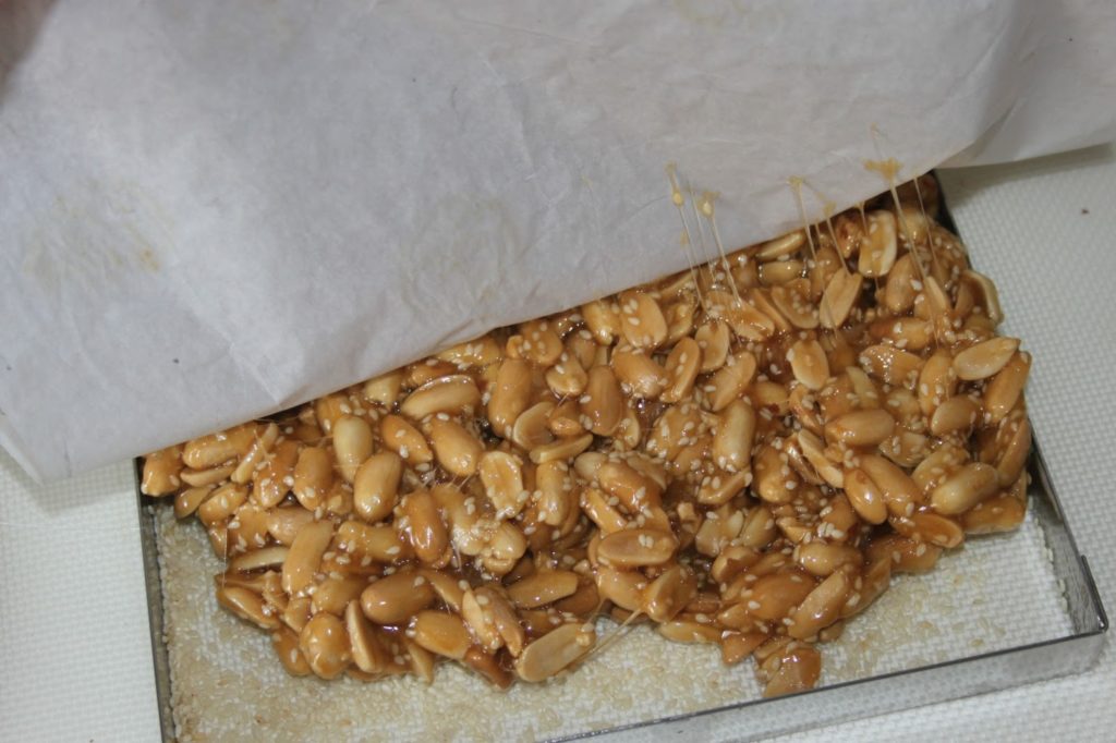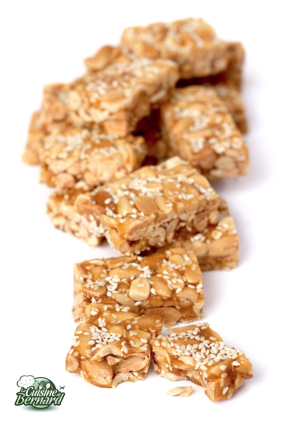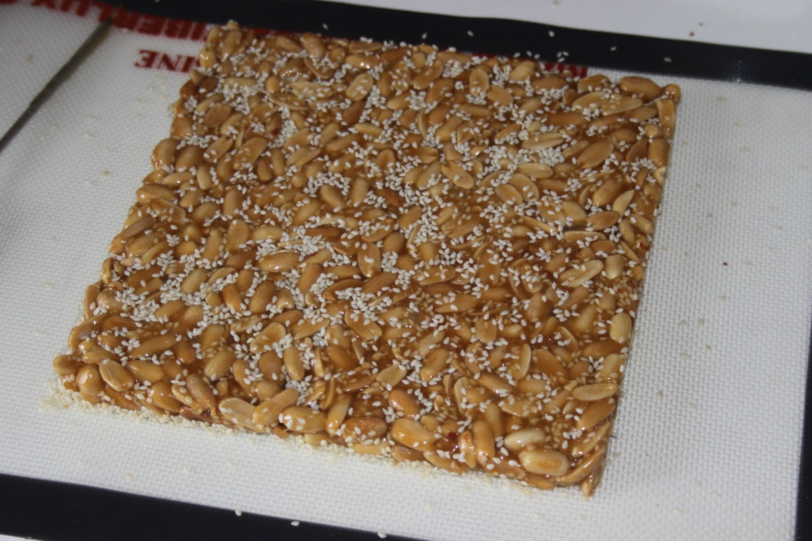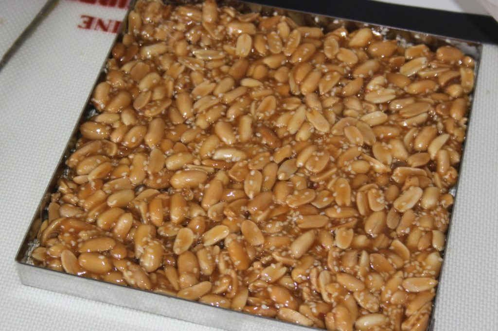 Si vous ne connaissez pas encore ce délicieux caramel chinois, il est temps de le goûter ! C’est une sorte de nougat dur très riche en cacahuètes et parsemé de graines de sésame. Cela se trouve un peu partout dans les boutiques asiatiques et ne coûte pas très cher. Alors pourquoi le faire soi-même? Pour le plaisir de le réaliser ! J’ai dû m’y reprendre à 3 fois avant de trouver la bonne proportion des ingrédients et la bonne quantité pour le cadre que j’utilise. Vous pourrez bien sûr réaliser cette recette sans cadre, en versant simplement le caramel sur un tapis siliconé ou un très bon papier sulfurisé. L’ingrédient (nouveau sur le blog) qu’il faut utiliser pour ce nougat est le sirop de maltose (que l’on trouve aussi en supermarché asiatique). C’est celui-ci qu’il faudra prendre pour obtenir la recette authentique. On pourra le remplacer par du miel…