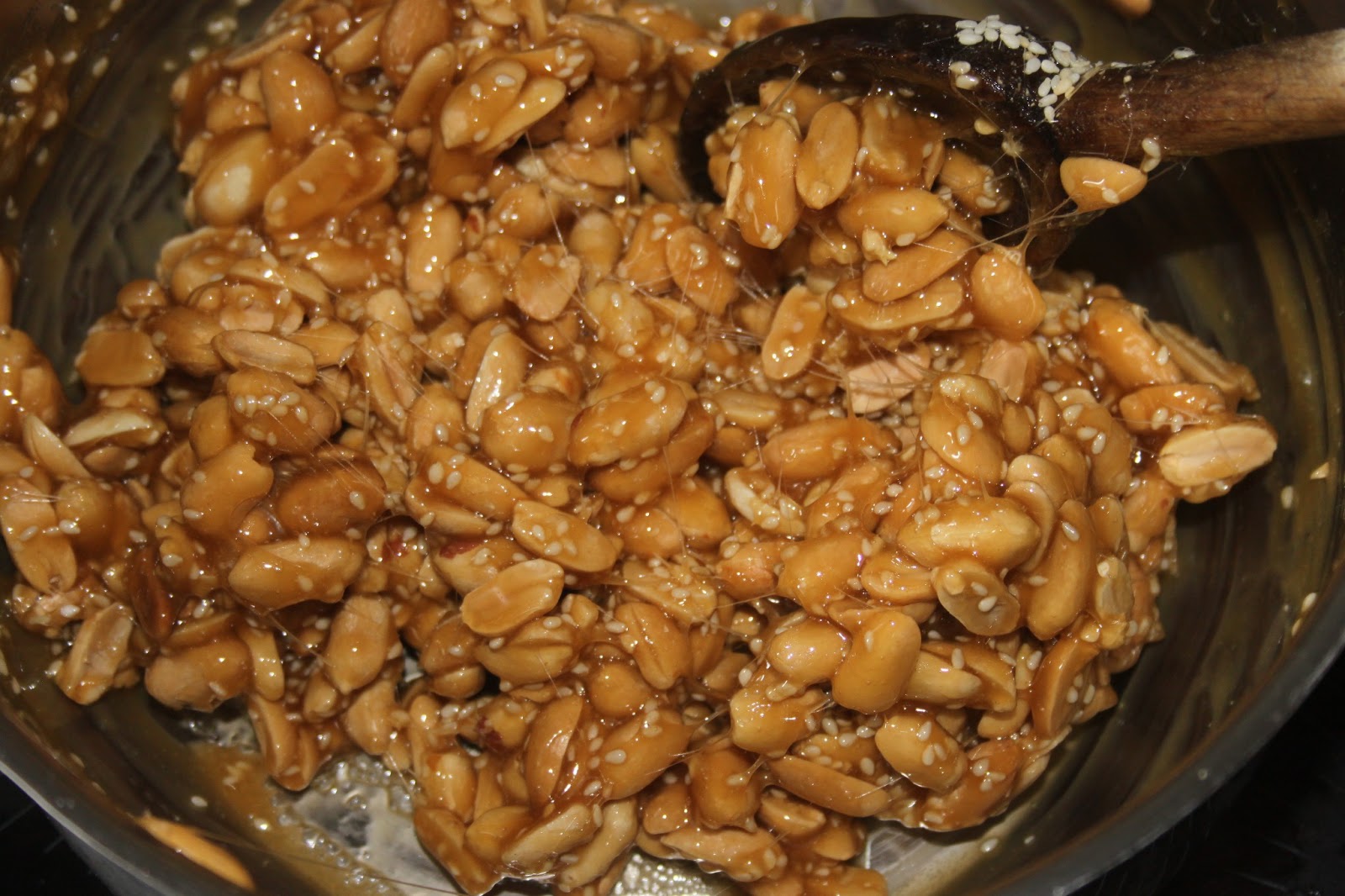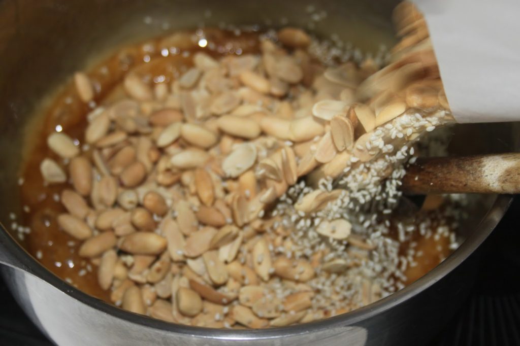 - Quand le caramel arrive à 145°C (il vaut mieux surveiller avec un thermomètre car le sirop est brun à cause du sirop de maltose), ajouter en une fois les fruits secs chauds.