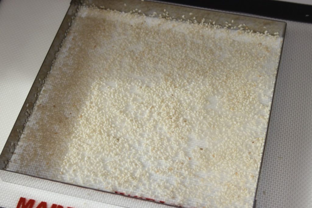 Prepara un marco de 18 x 18 cm sobre un tapete para hornear (o un buen papel de horno o de silicona) aceitando el borde interior (o con un spray de papel antiadherente). A continuación, vierta un pequeño lecho de semillas de sésamo.