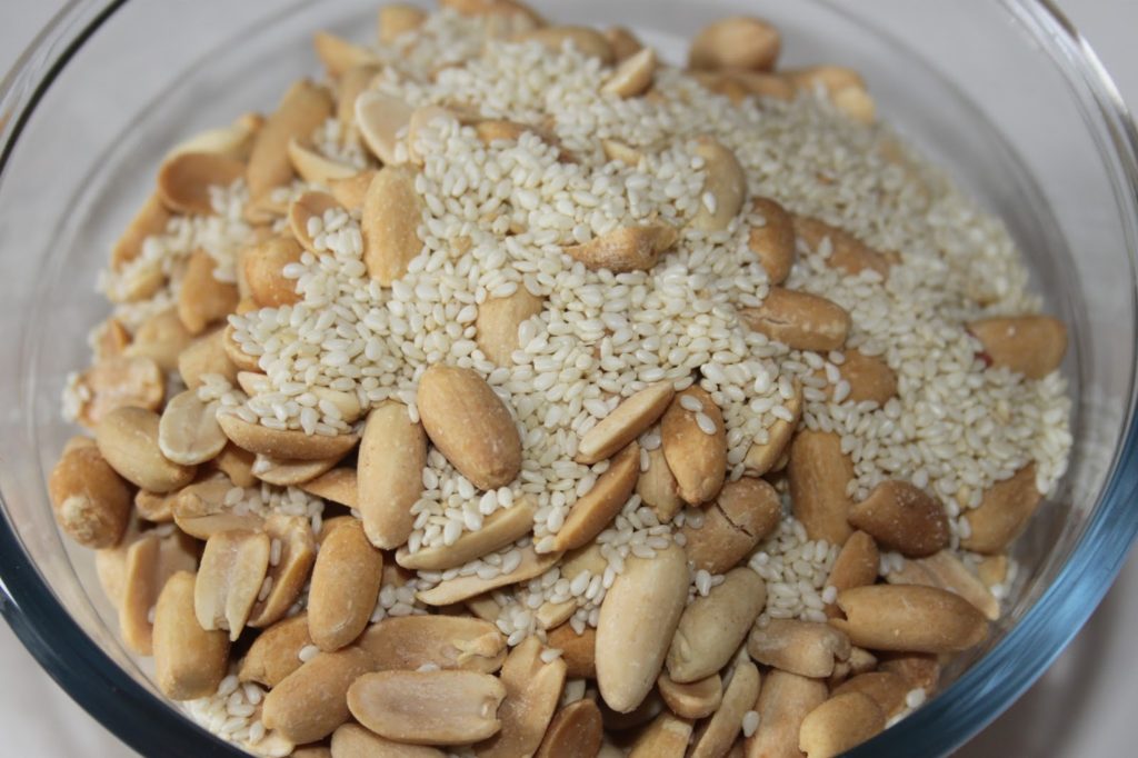 - Pendant ce temps, mettre les cacahuètes et les graines de sésame sur une plaque pour aller au four préchauffé à 150°C. (Si les cacahuètes ne sont pas grillées, il suffira de les mettre dans ce cas 10-12 minutes à 180°C).