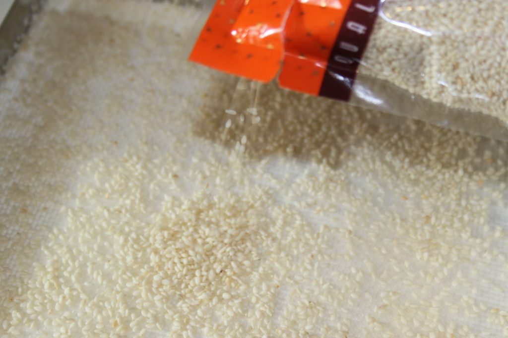 - Ajouter encore quelques graines de sésame puis les coller en aplatissant légèrement avec le papier sulfurisé.