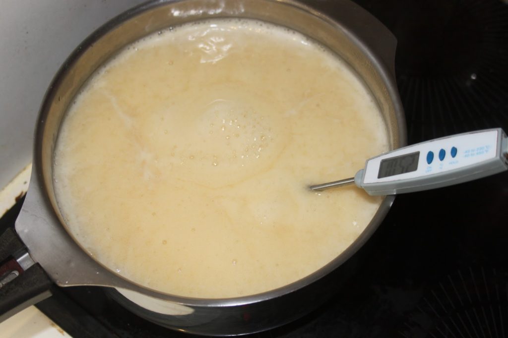 Remover el jarabe regularmente con una cuchara de madera. Es necesario llegar hasta los 145°C. Así que tenemos tiempo de sobra.