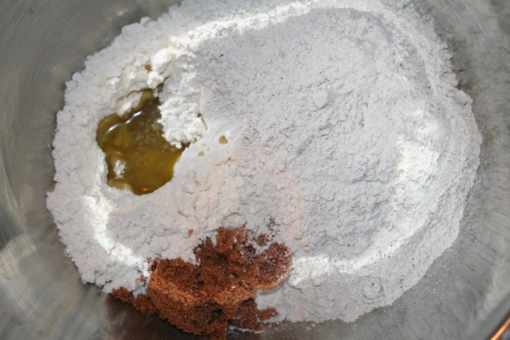Mettre tous les autres ingrédients dans un bol, à savoir la farine blanche, la farine de seigle, le bicarbonate de soude, la fleur de sel, la vergeoise brune et l’huile d’olive.