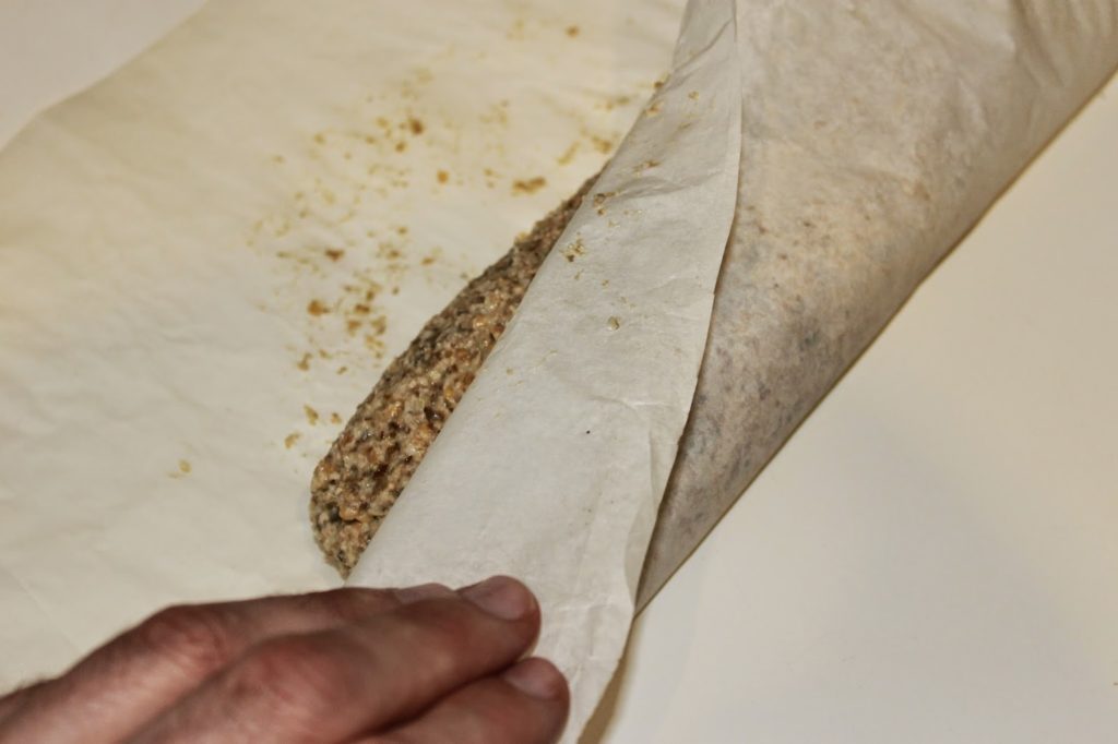 - La pâte étant très molle et surtout très collante aux doigts, travaillez-la en vous aidant du papier pour la façonner.