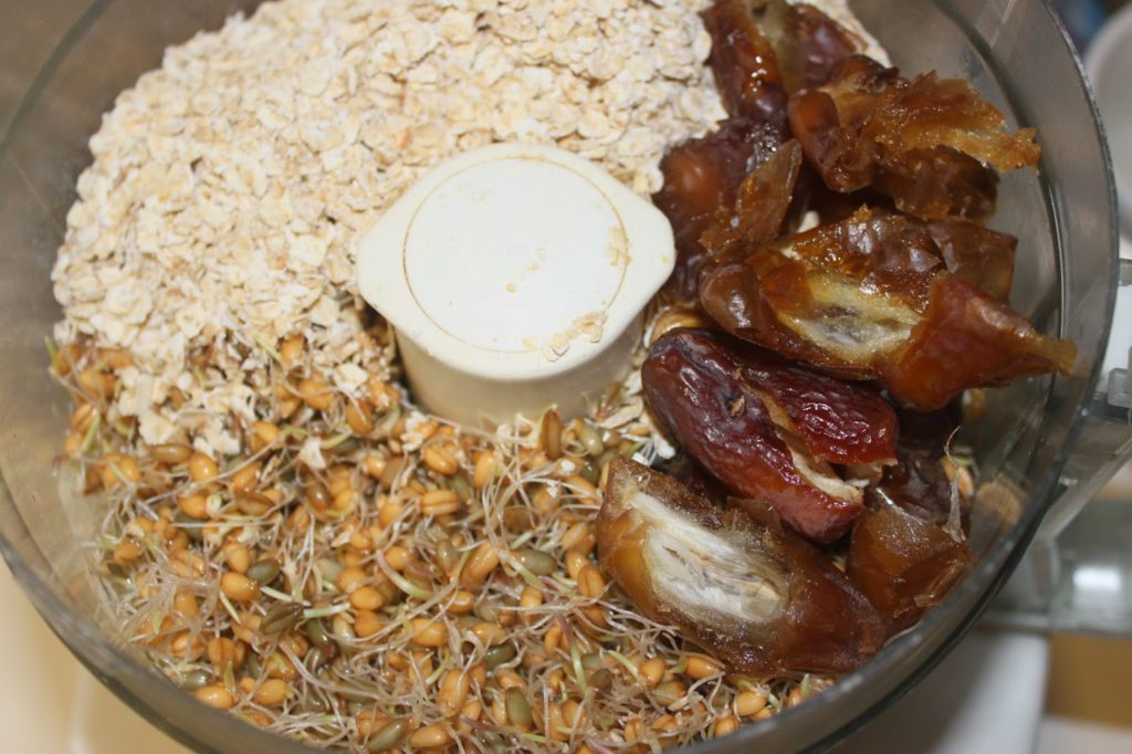 - Séchez-les bien, dans du papier absorbant. Vous pourrez les conserver pendant 2 ou 3 jours au réfrigérateur. Pour la pâte, mettez toutes les graines germées, les flocons d’avoine, les dattes dénoyautées et l’huile de colza. Vous pouvez bien sûr y mettre des figues séchées à la place ou un mélange et même ajouter quelques fruits secs (dans ce cas, mettez-les une fois la pâte mixée).
