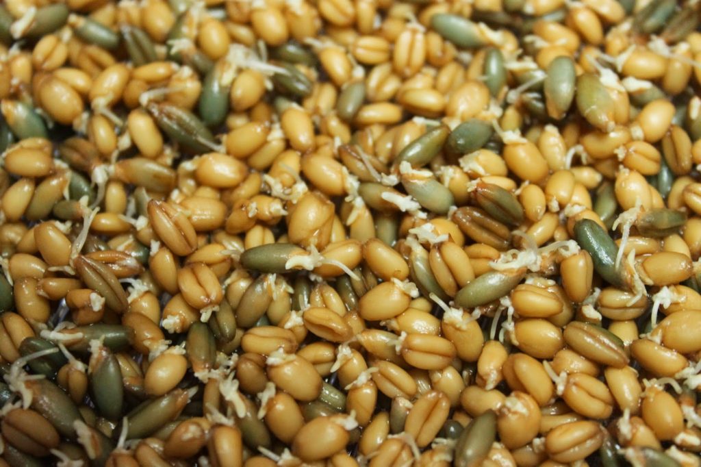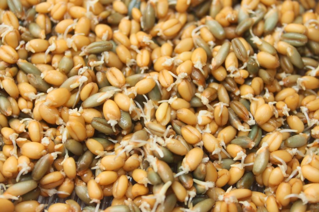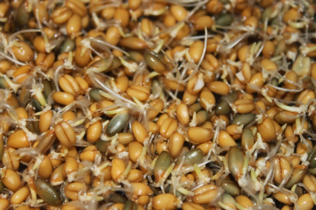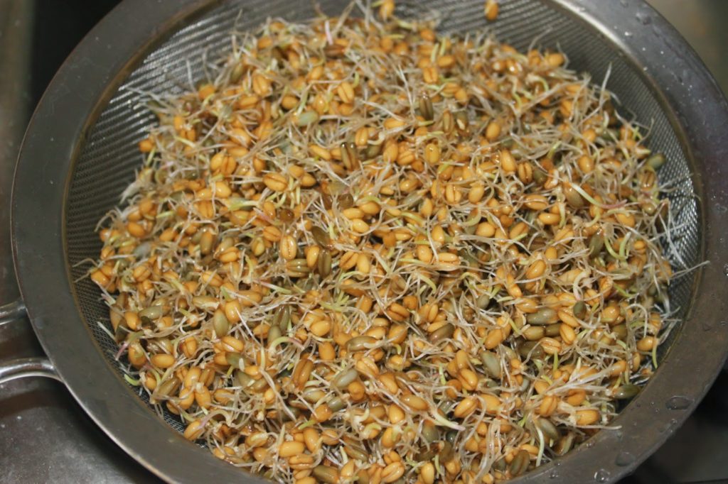 - …jusqu’au jour J, 48h après le début, en les arrosant 2 fois par jour. On voit que ça a bien poussé ! Mais ce ne sont que des « demi-pousses ». Ce n’est par exemple pas suffisant pour une salade par exemple, mais parfait pour ce pain ! Vous devriez avoir en gros 480g de graines germées (au départ 240g sèches).Si chez vous, cela prend plus de temps, attendez jusqu’à ce que les graines ressemblent à cela :