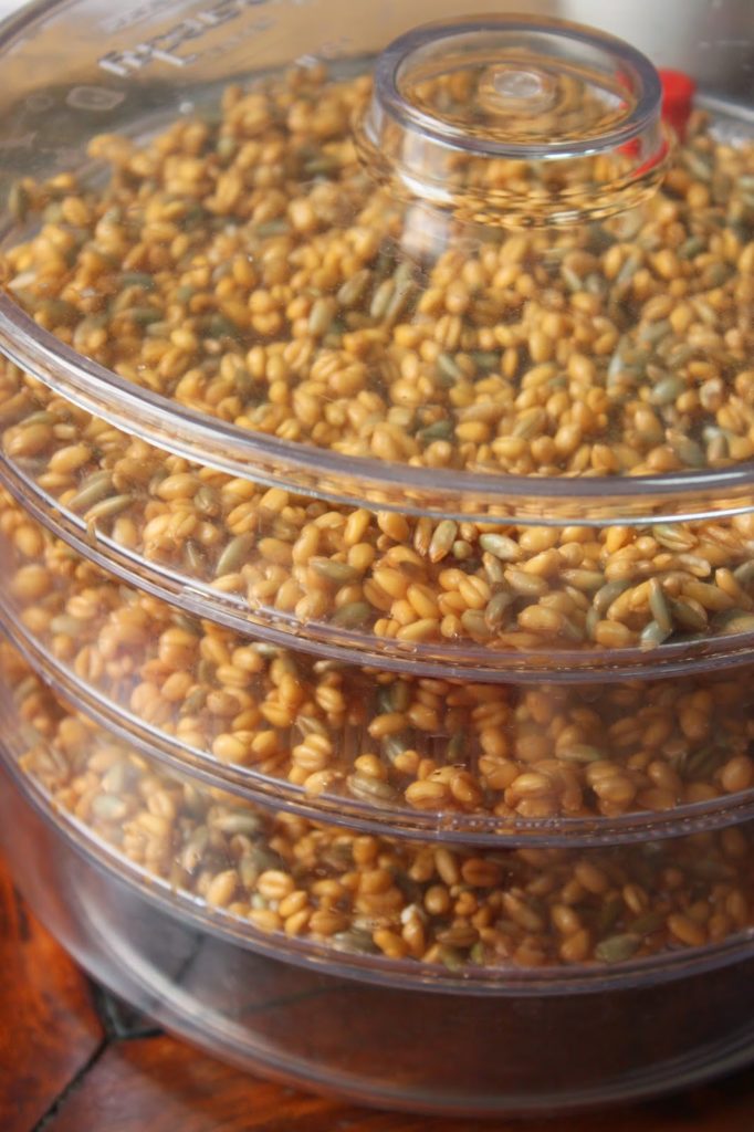 - Après ce temps, passez-les sous l’eau dans une fine passoire puis égouttez-les bien. Divisez la quantité en trois pour un germoir à trois étages. Si vous avez un germoir plus petit, il faudra diminuer les quantités ! Arrosez maintenant les graines comme vous pouvez le faire d’habitude. En général, on nous dit d’éviter de mettre trop de graines. Pour mon premier essai expérimental de pain essène, je n’ai mis que la quantité de graines maximum à germer selon les indications de mon germoir. Du coup au moment de faire la pâte, je me suis retrouvé avec un tout petit pain… Cette fois, je n’ai pas hésité à en mettre 4 fois plus et cela marche très bien pour cette recette car je ne fais pas germer au maximum les graines, juste 48H. Si je voulais les faire germer plus, en effet je pense qu’elles manqueraient de place, mais là c’est parfait et au moins j’ai plein de pâte !