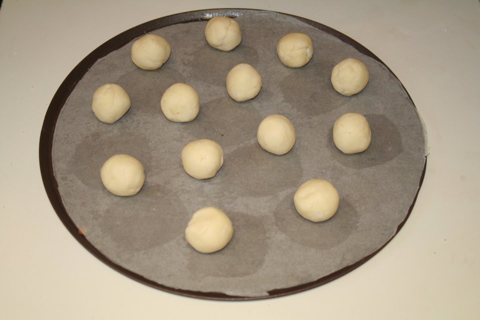 - Préchauffer le four à 180°C. Disposer sur une plaque à pâtisserie des boulettes de pâte de la grosseur d’une noix. On peut en mettre beaucoup sur une plaque car les pains vont assez peu gonfler au final.