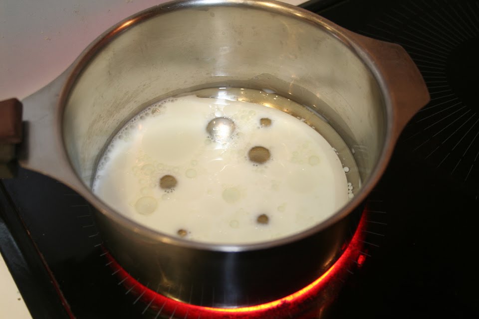 - Faire chauffer dans une casserole le lait et l’huile jusqu’à ébullition, enlever du feu.