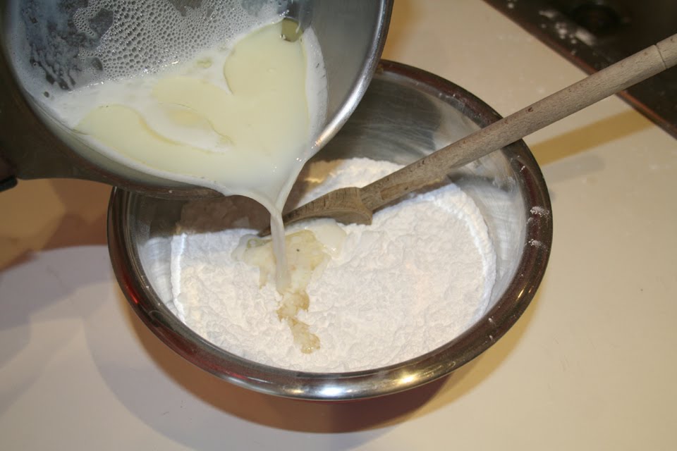 - Pendant que le lait/huile chauffe, mettre la farine de tapioca et le sel dans une terrine et bien mélanger. Verser dessus le mélange liquide très chaud puis mélanger vigoureusement.