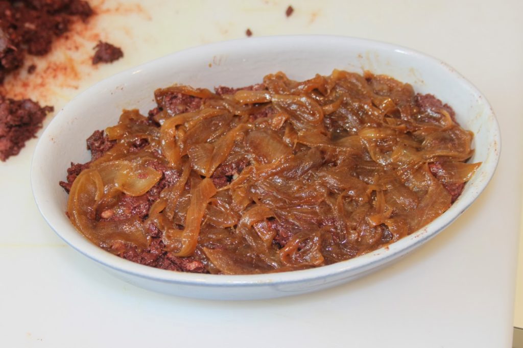 - Mettez ensuite le boudin (ici je remplis un petit plat car j’en ai fait deux) puis les oignons caramélisés.
