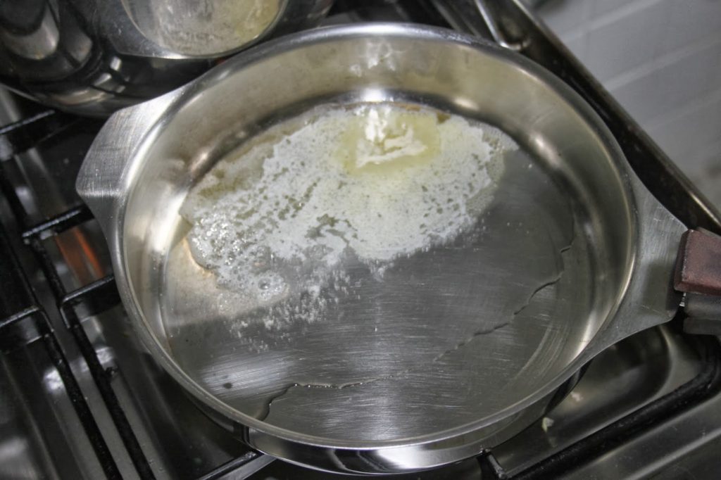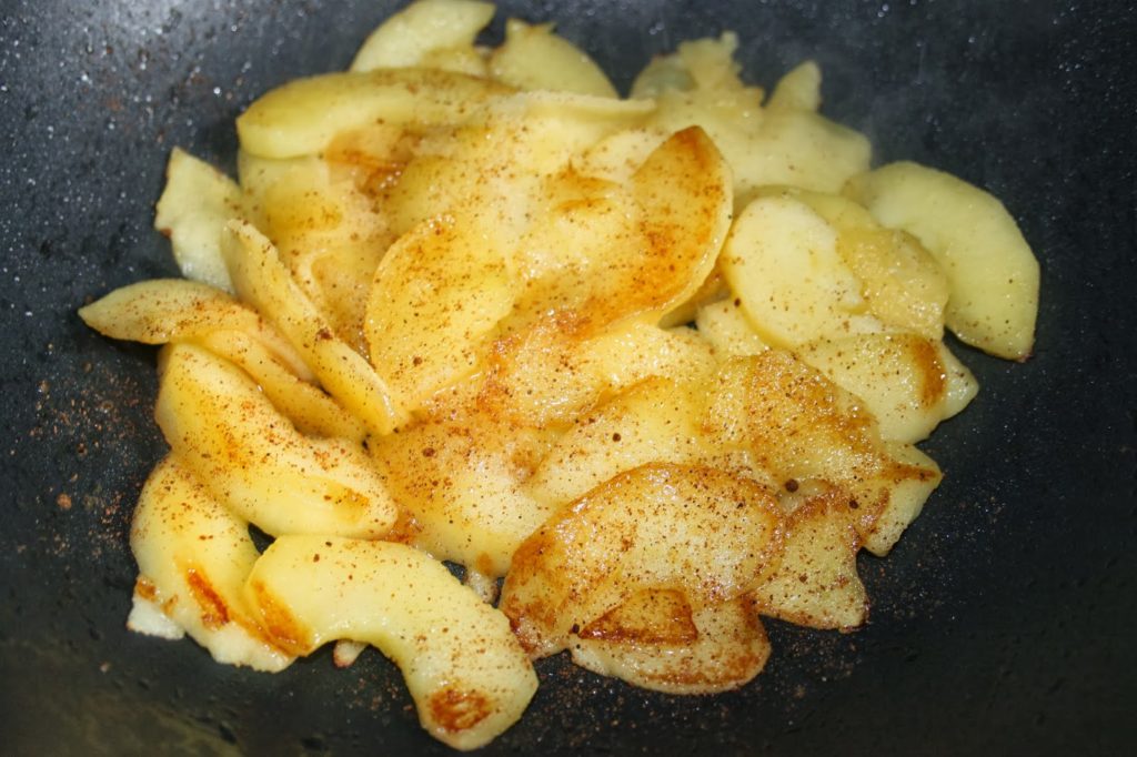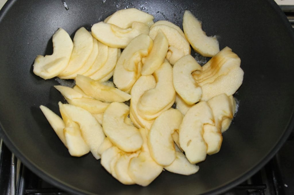 Faites chauffer une poêle sur feu vif avec un peu de beurre. Ajoutez les pommes.