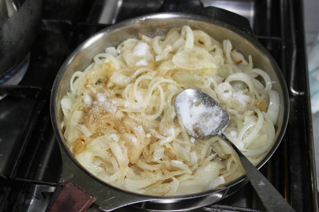 - Ajoutez le sucre, le sel, le poivre. Laissez-les caraméliser sur feu assez vif. Dès que la couleur devient trop prononcée, ajoutez un peu d’eau.