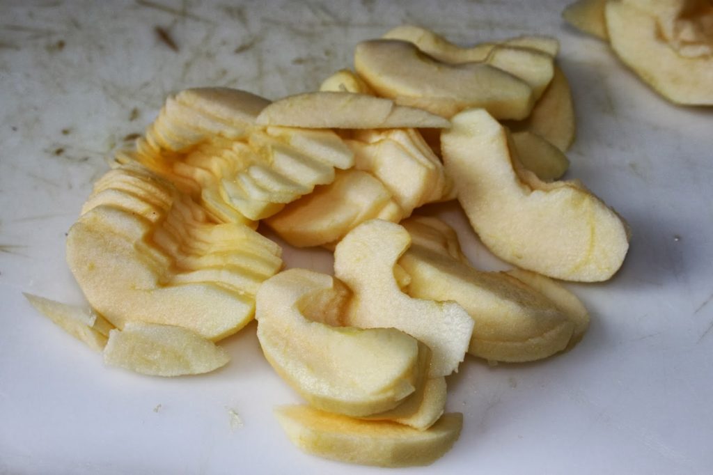 - Épluchez et videz les pommes. Coupez en fines tranches.