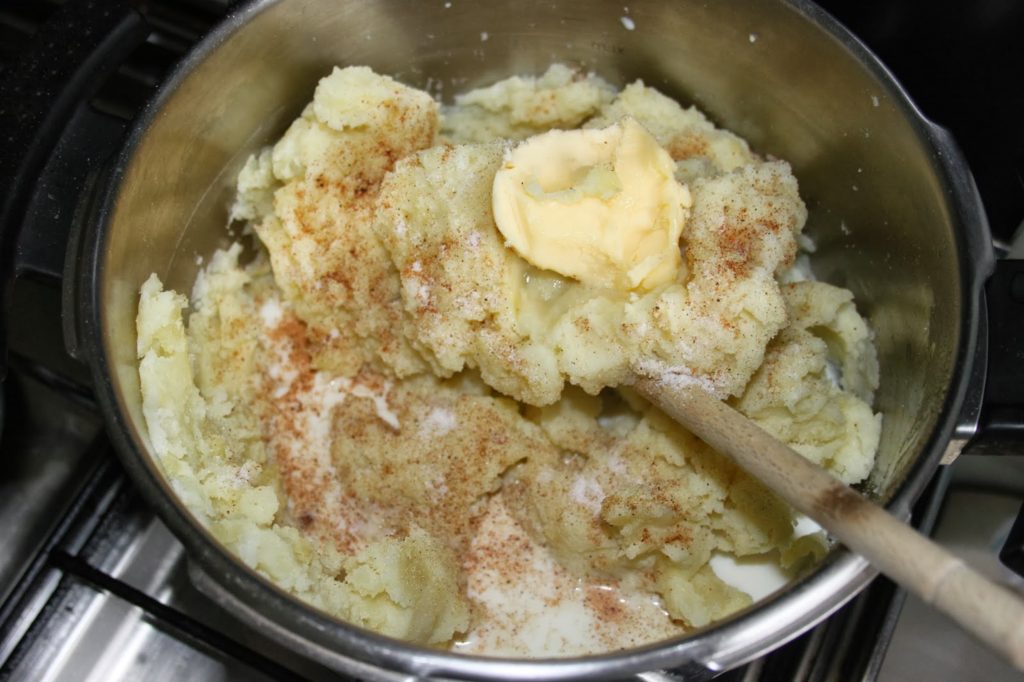 Égouttez les pommes de terre puis remettez-les dans la casserole. Écrasez-les en purée. Je préfère la purée avec des grumeaux, c’est tellement bon !