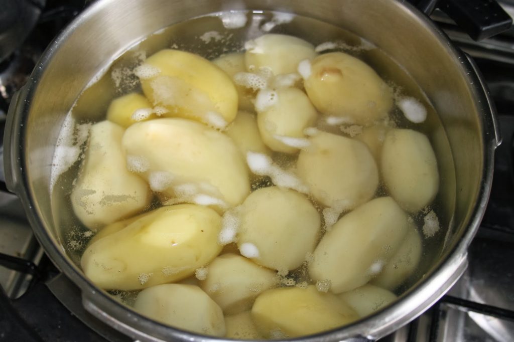 Préparez tout d’abord la purée. Épluchez vos pommes de terre et faites les cuire 20 à 30 minutes à l’eau (ou même à la vapeur). Il suffira de vérifier la cuisson en plantant une fourchette dans une grosse pomme de terre. Elle doit pouvoir y rentrer facilement.