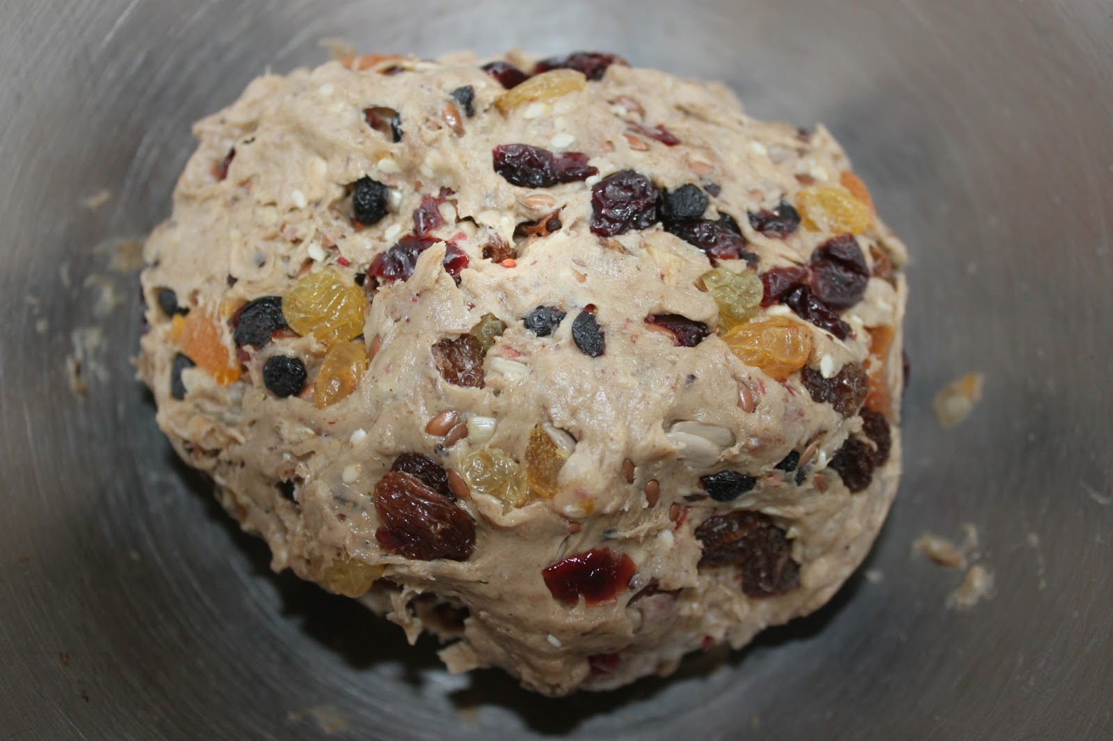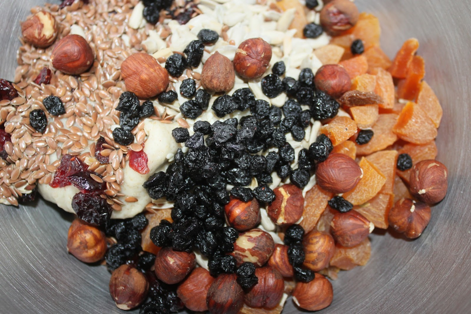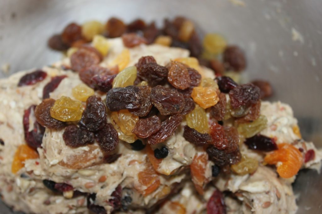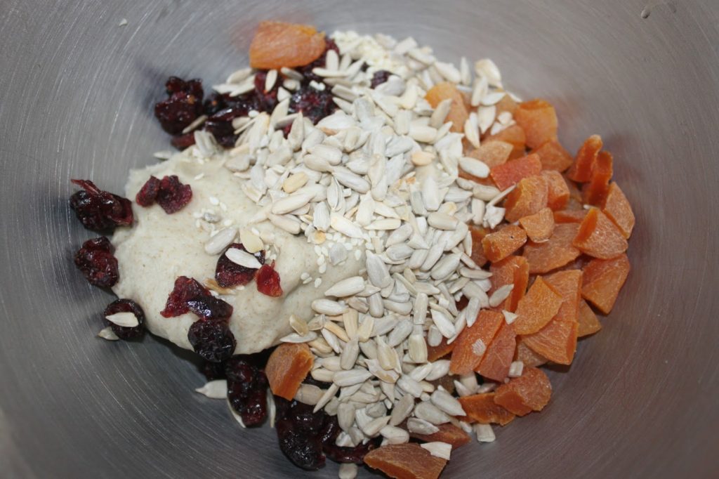 Replacez la pâte dans le récipient puis ajoutez tous les fruits secs. Coupez juste les abricots en morceaux, le reste se mettant tel quel.