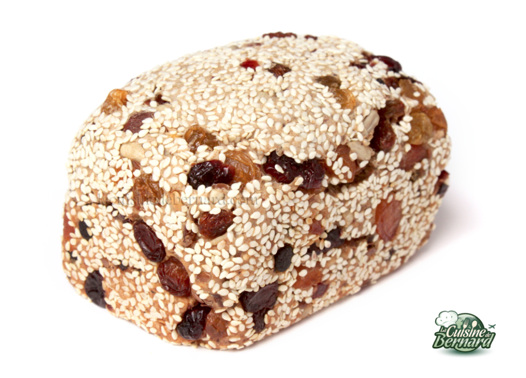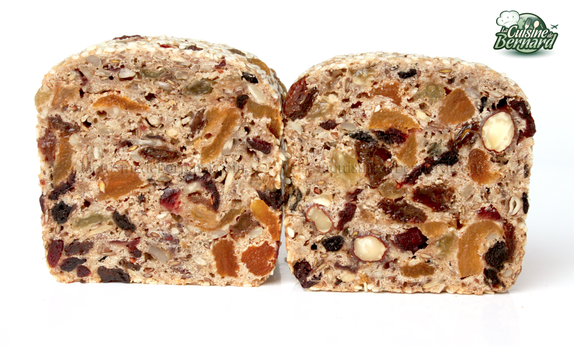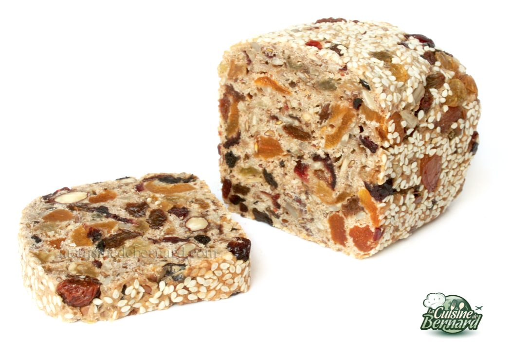 L’autre jour, j’étais à Amsterdam et j’ai découvert dans un magasin, ce petit pain au muesli, très riche en fruits secs. J’ai tout de suite adoré son poids. Je n’ai pas fait le test, mais je suis presque sûr qu’il coule dans l’eau ! Plus proche d’un gâteau que du pain, il est dense et terriblement délicieux. Ni une ni deux, dès que je suis arrivé chez moi, j’en ai composé une recette quasi similaire. Son unique secret: le pourcentage de fruits. Il y en a en effet plus de la moitié ! Il est parfait pour le petit déjeuner ou le goûter et vous pourrez varier à l’infini la composition des fruits.