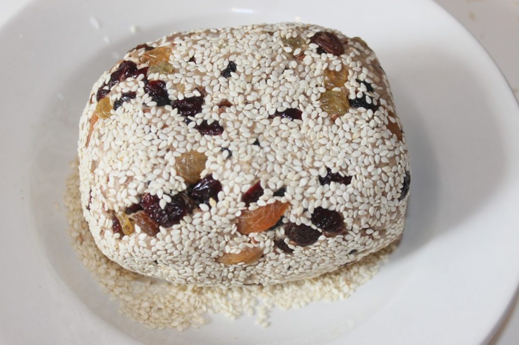 - Mettez des graines de sésame (grillées ou non) dans un assiette puis roulez la boule de pâte dedans. Les graines vont tout de suite coller.