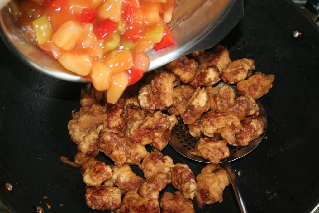 - Vider l’huile du wok dans un autre contenant (une casserole vide) et remettre les morceaux de porc frits dans le wok, verser sur les beignets la sauce aigre-douce.