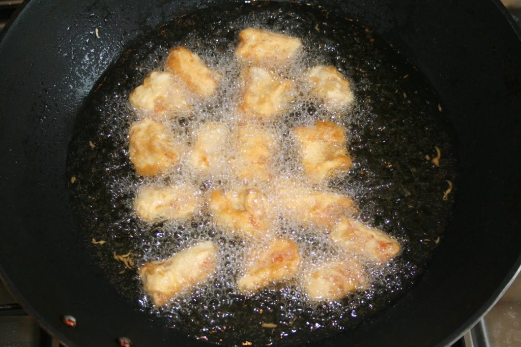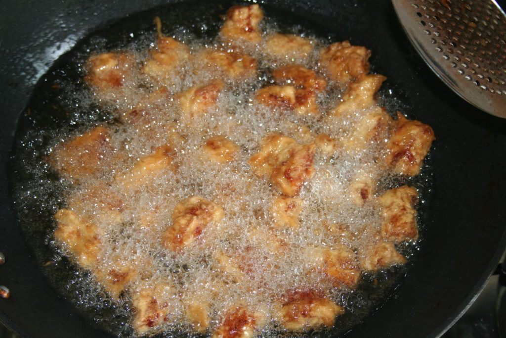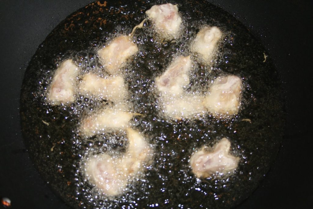 - Chauffer de l’huile dans un wok ou uen casserole. Quand l’huile est bien chaude, ajouter les morceaux de porc un à un. Ne pas mettre trop de porc à frire en même temps. Faire cuire en deux ou trois fois!