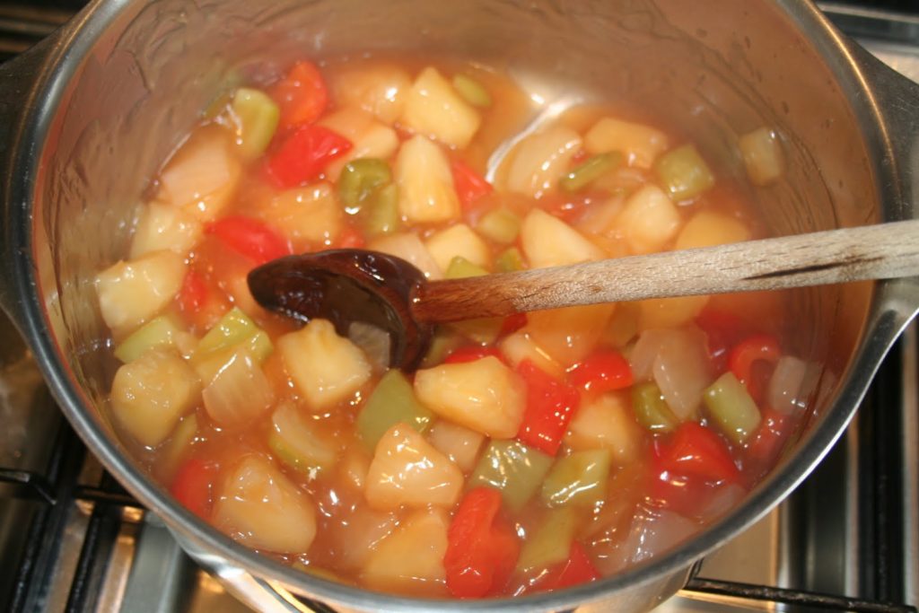 - Ajouter les légumes, poivrons, oignons et l’ananas. Mettre sur feu doux pendant une dizaine de minutes pour juste cuire l’oignon et les poivrrons. Donc on peut faire cuire un peu plus ou un peu moins.