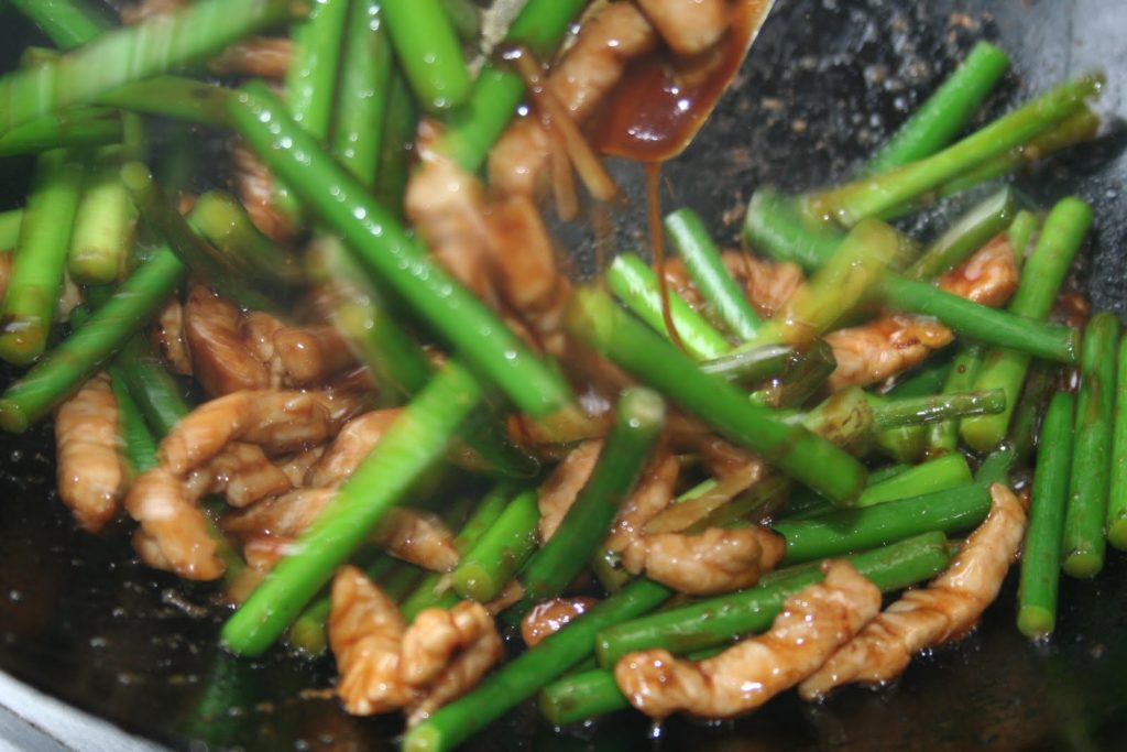 Petit séjour à Pékin où j’ai de nouveau pris un cours de cuisine authentique. Un des plats de ce cours a été le porc sauté aux pousses d’ail (oui « pousses » et non « gousses »!!). Facile à faire. Le plus difficile est de trouver les pousses d’ail, ce qui ne pose pas de souci si on se rend dans une épicerie asiatique! Les pousses d’ail font plus penser à des sortes de haricots verts avec un léger goût d’ail. On peut aussi remplacer ce légume par un autre légume vert.