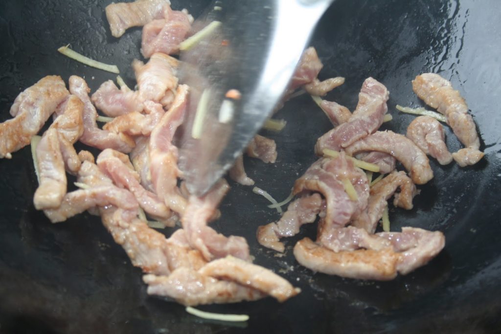 - Faire revenir en séparant bien les morceaux de porc pour qu’ils se colorent puis ajouter le gingembre en julienne.