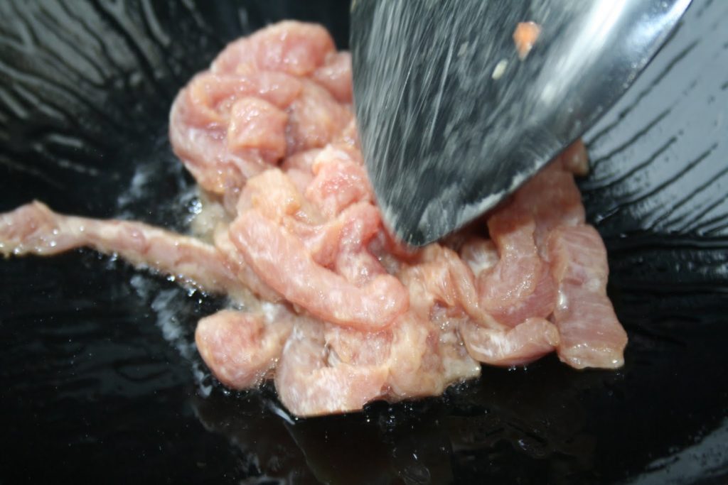 - Remettre le wok vide sur feu fort, ajouter 3 cuillerées à soupe d’huile puis ajouter le porc avec la marinade.