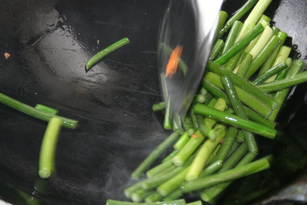 - Chauffer le wok assez fort avec deux cuillerées à soupe d’huile. Ajouter les pousses d’ail puis deux cuillerées à soupe d’eau (ceci afin de cuire les pousses). Faire revenir le tout 1 minutes puis retirer les pousses du wok et mettre de côté.