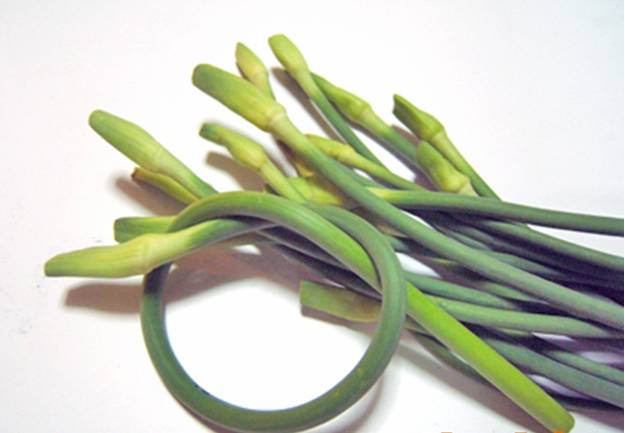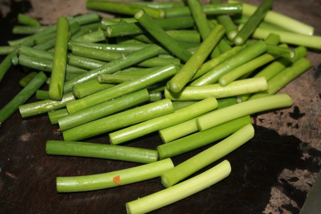 - Laver les pousses d’ail, couper la fleur sur le dessus. Couper les pousses en morceaux de 5 cm environ.