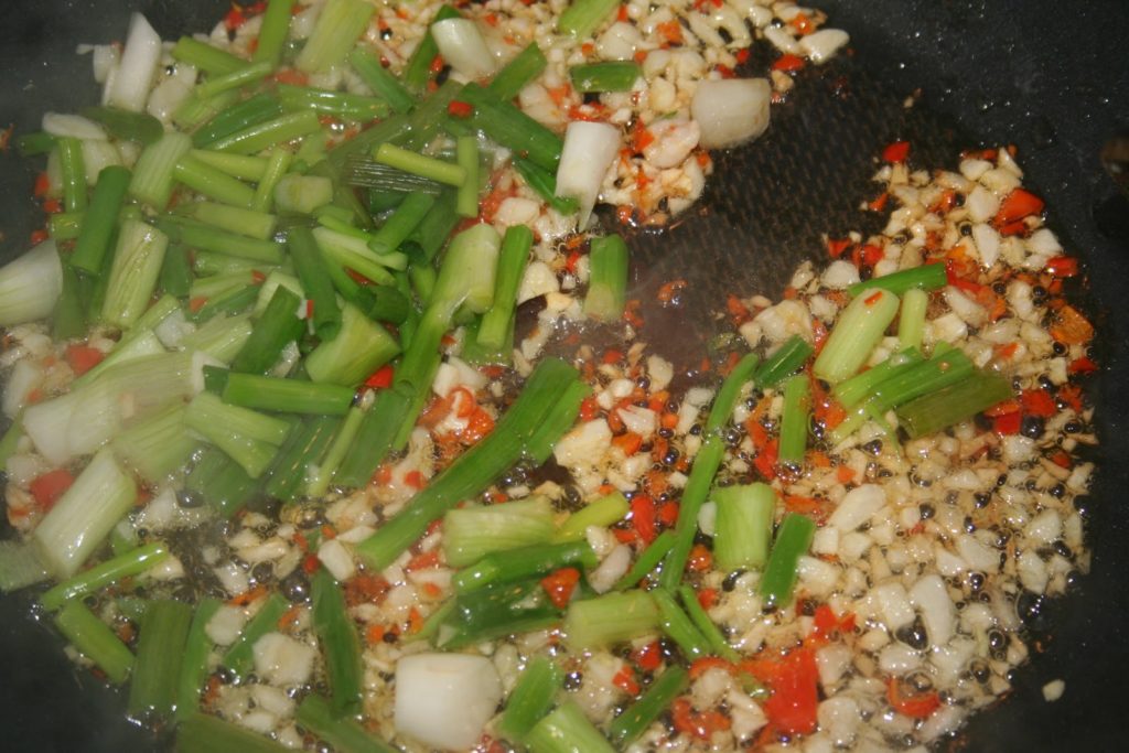 - Quand l’ail se colore, ajouter les oignons chinois.