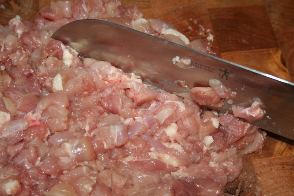Désosser les hauts de cuisse et enlever la peau. Les couper en très petits morceaux. Il faut presque les hacher.