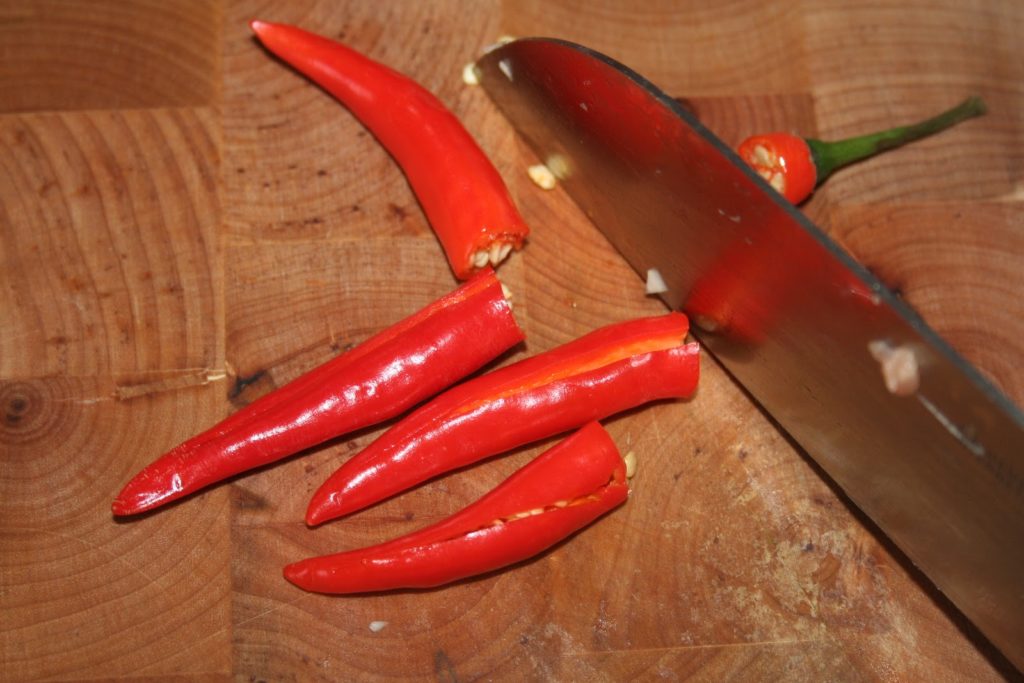 - Avec des gants en latex, équeuter et égrainer les piments oiseaux rouges. Ce sont les graines qui donnent le piquant vraiment piquant, alors sans le plat sera relevé mais ce ne sera pas insupportable.On peut laisser les graines mais alors là c’est l’incendie de bouche assuré!