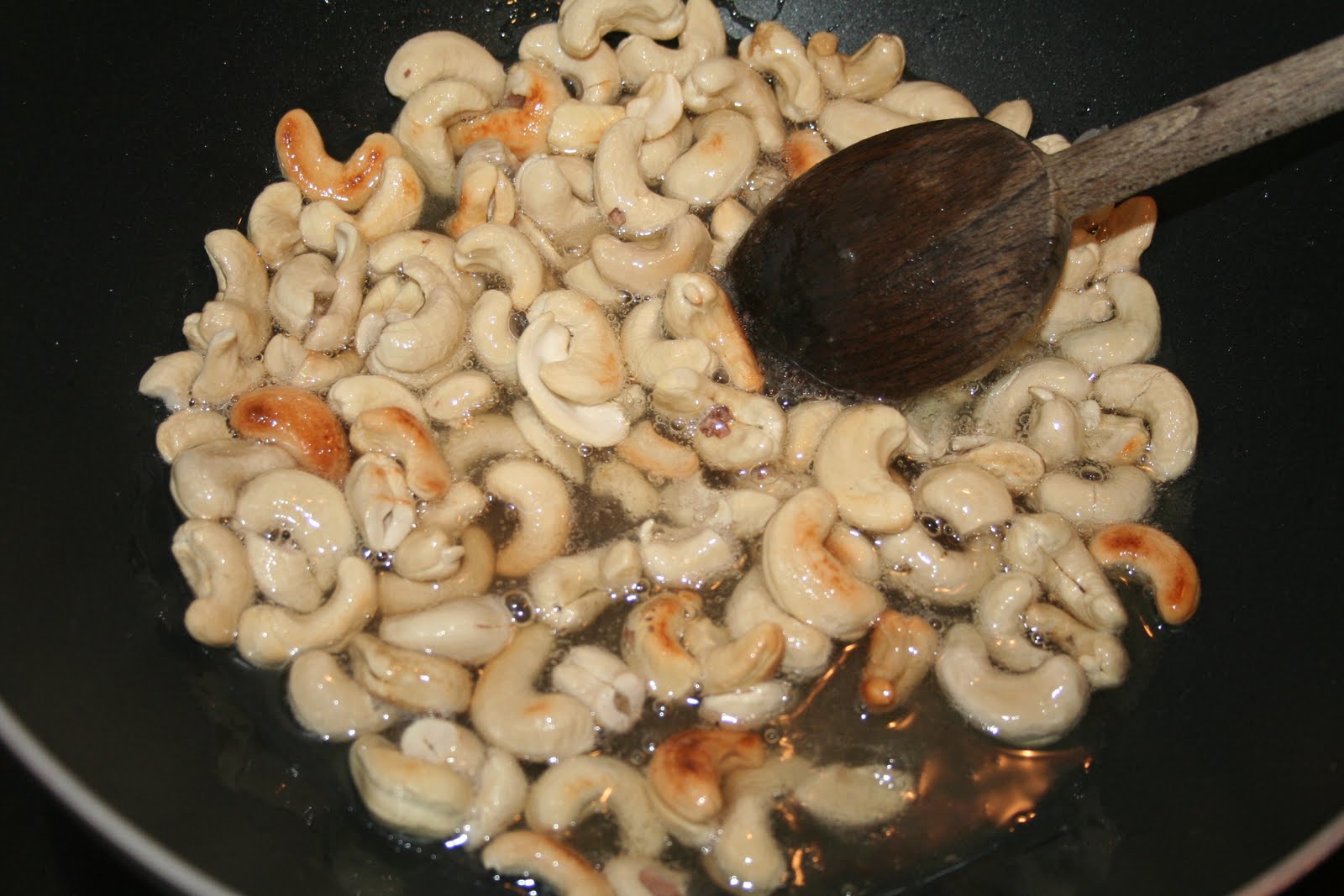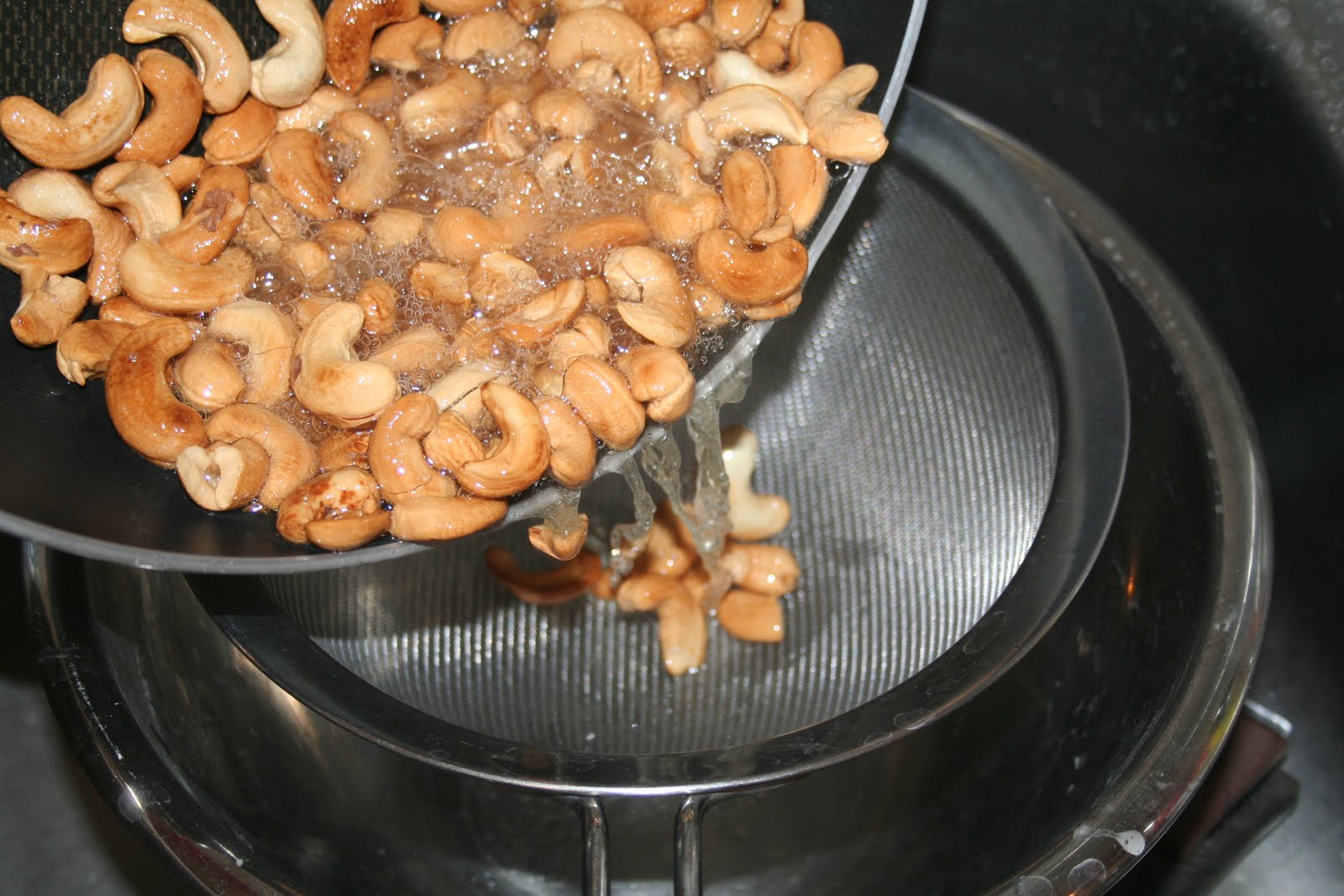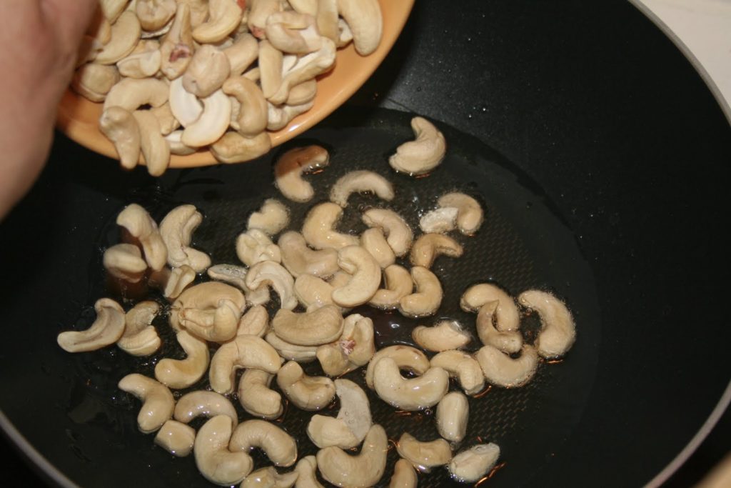 - Mettre de l’huile (1 bon centimètre) dans un wok ou une large poêle. Quand l’huile est bien chaude, faire frire les noix de cajou crues.